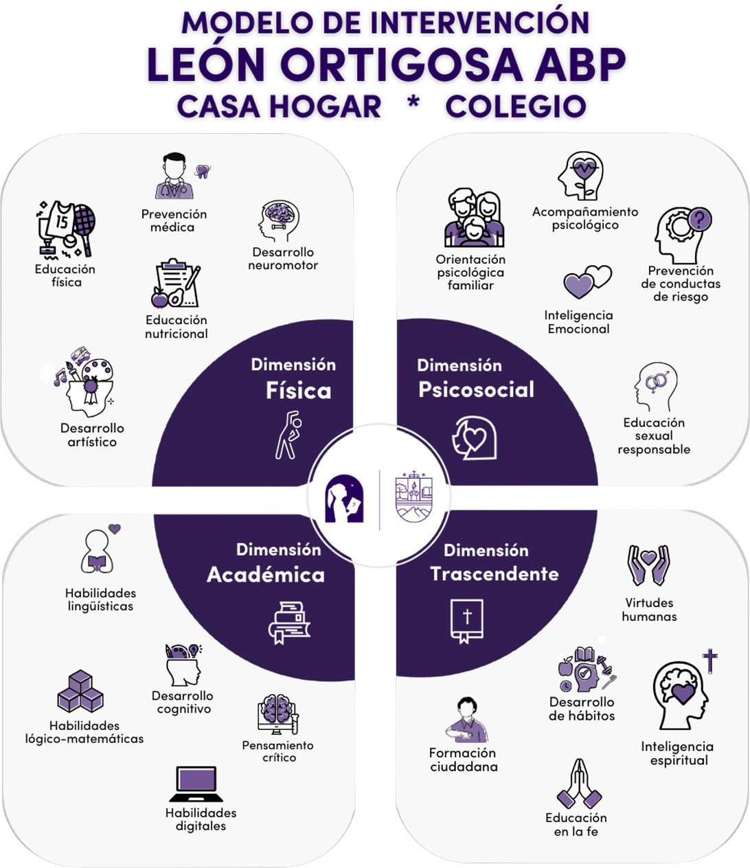 Los programas y planes del Modelo de Atención Ortigosa abarcan las dimensiones física, psicosocial, académica y trascendente de la persona, por medio de los cuales se promueve el desarrollo de hábitos, valores, capacidades de pensamiento crítico y de aprendizaje, entre otros aspectos que son transmitidos a sus familias y entorno.
